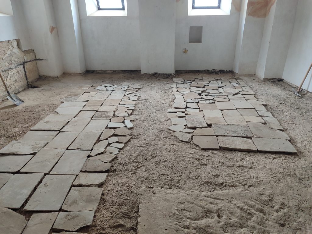 Obnova v súčasnej etape pokračovala odstránením novodobej terazzovej podlahy a betónového podložia. Pod novodobou podlahou sa zachovali kusy štiepaného pieskovca, ktoré tvorili podlahu v barokovom období. Miera zachovania je približne 30 %. Historická dlažba bola deponovaná a bude použitá pri rekonštrukcii. Zásah bol nutný nie len ako súčasť obnovy historických a estetických hodnôt, ale aj pre potreby riešenia sanácie vlhkosti.